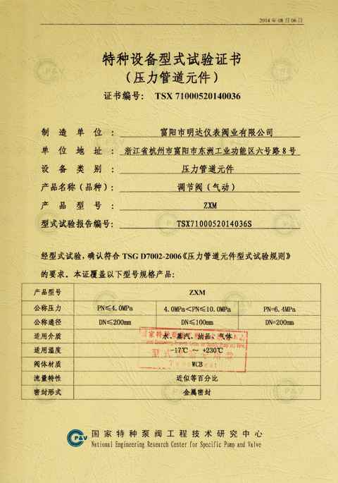 气动调节阀型式试验证书