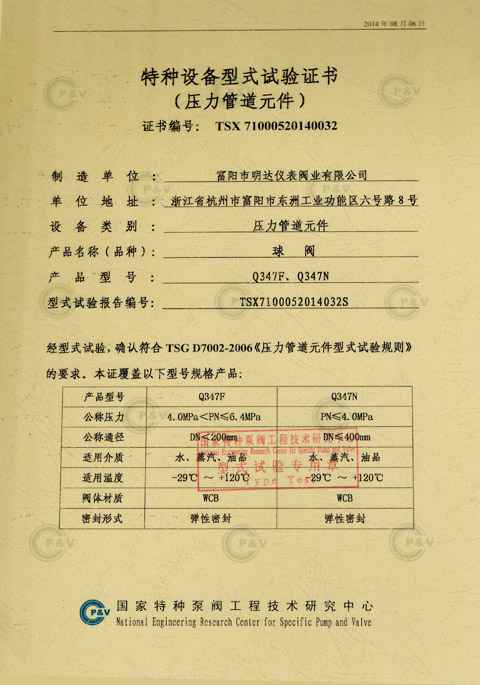 球阀调节阀型式试验证书