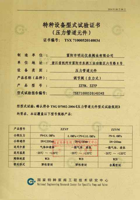 自力式调节阀型式试验证书